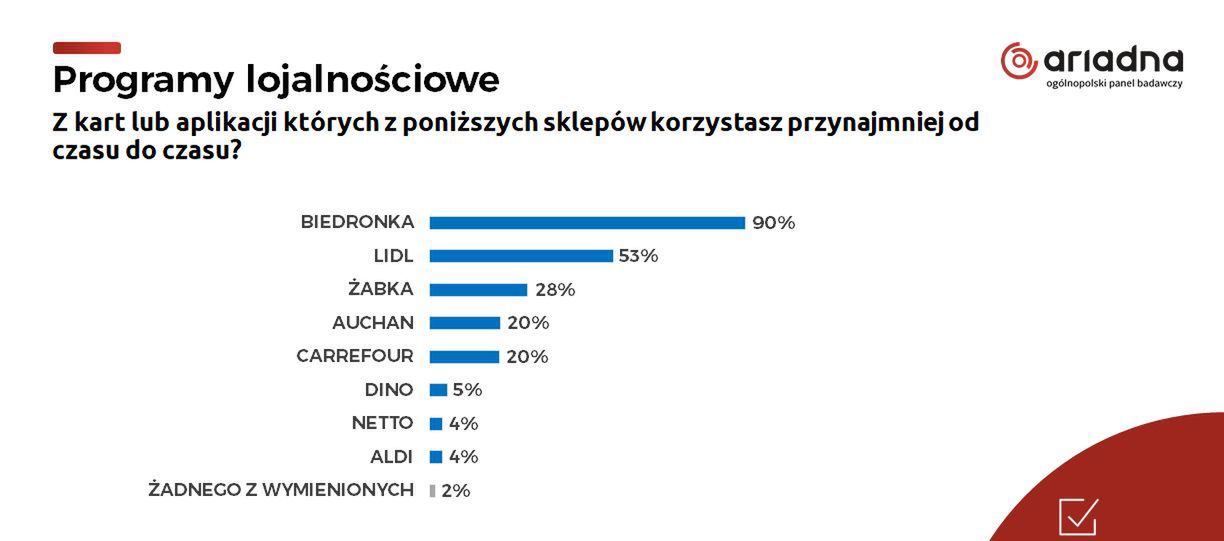 Miażdżąca większość spośród uczestniczących w programach wybiera kartę Biedronki (90 proc.). Drugie miejsce zajęła aplikacja lojalnościowa Lidla (53 proc.), a trzecie - Żabki (28 proc.). Ankietowani wskazywali także programy lojalnościowe Auchan i Carrefour (po 20 proc.), Dino (5 proc.) oraz Netto i Aldi (po 4 proc.).