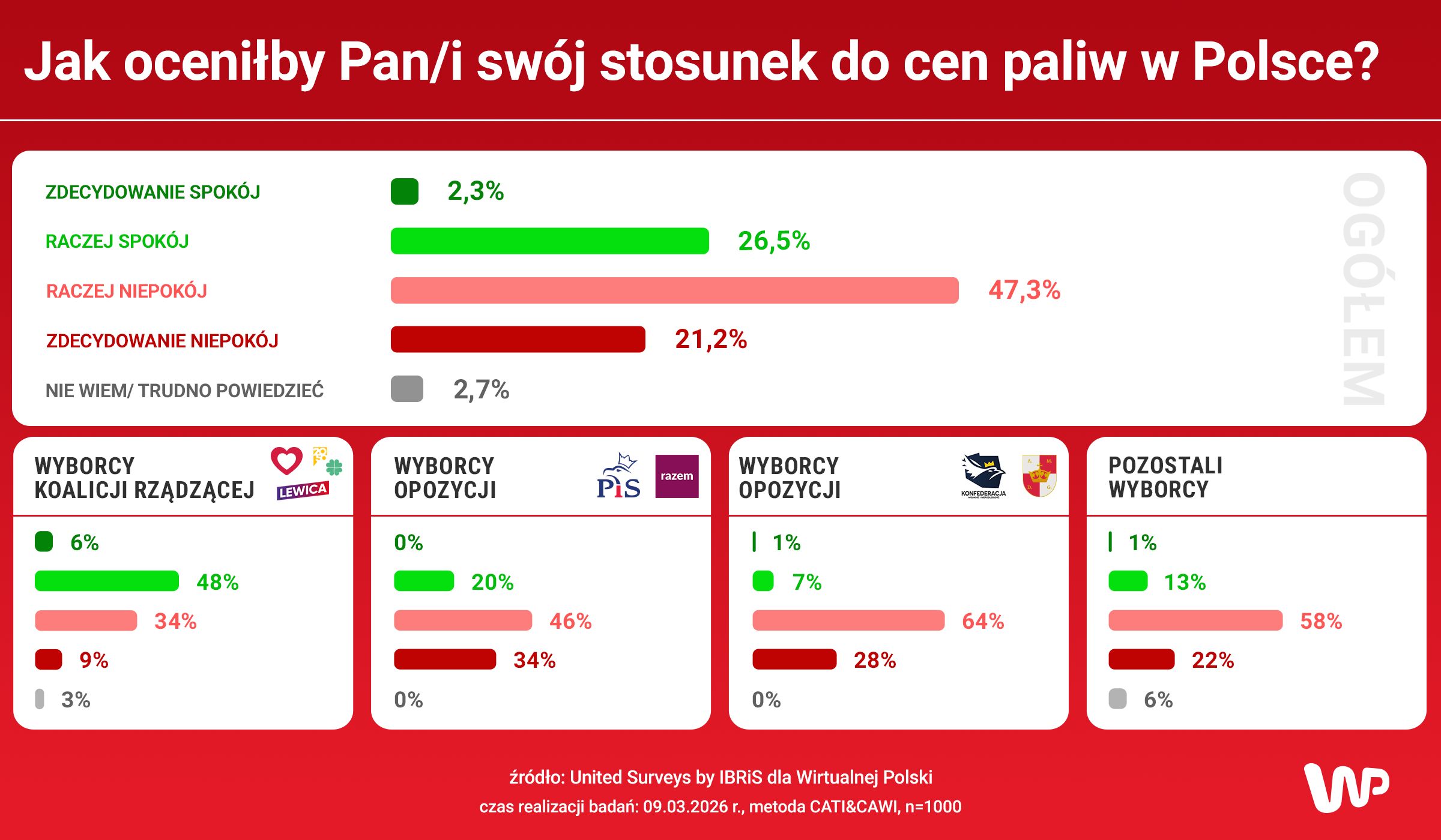 Badanie United Surveys by IBRiS dla Wirtualnej Polski zostało zrealizowane w dniu 9.03.2026 r., metodą mieszaną CATI&CAWI, na próbie 1000 dorosłych Polaków.