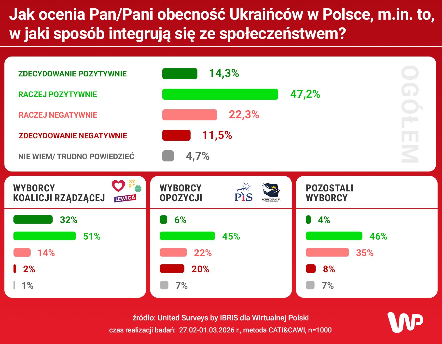 Z badania przeprowadzonego dla Wirtualnej Polski - cztery lata po rozpoczęciu wojny w Ukrainie - wynika, że łącznie 61,5 proc. respondentów ocenia obecność i integrację Ukraińców w Polsce w sposób pozytywny. Na tę grupę składa się 14,3 proc. odpowiedzi "zdecydowanie pozytywnie" oraz 47,2 proc. "raczej pozytywnie".