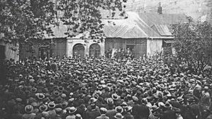 Sierpień1929. Na zdjęciu wiec strajkujących szoferów na dziedzińcu domu przy ul. Wareckiej 37, na którym postanowiono kontynuować strajk.