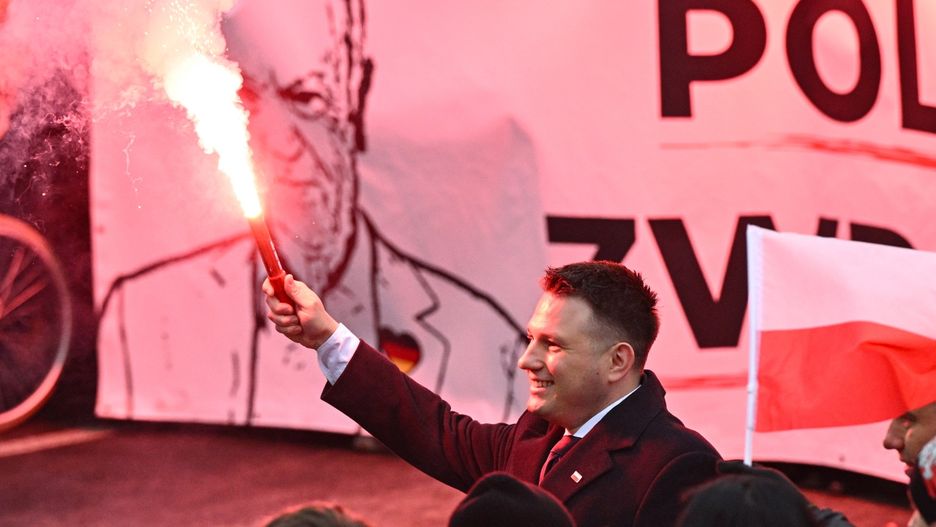 Mentzen złamał zakaz. Odpalił racę na tle zdjęcia Tuska