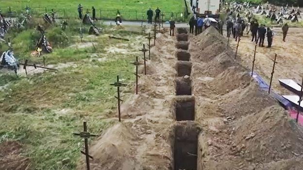 W obecności tylko grabarzy i księdza ciała 2 kobiet i 9 mężczyzn pochowano w Buczy. W masowym grobie niedaleko kościoła św. Andrzeja Apostoła w Buczy odkryto dziesięć ciał zaraz po wycofaniu się wojsk rosyjskich 31 marca. Jedenaste ciało należało do osoby, która została zastrzelona i znaleziona we wsi Chervone 17 km od miasta. Ciała zostały ponumerowane. Numer ten był następnie przyczepiany do krucyfiksu przy każdym grobie. To już drugi masowy pogrzeb nierozpoznanych ciał w Buczy. Pierwszy pochówek miał miejsce 9 sierpnia, kiedy złożono w grobach 15 osób. Według Rady Miejskiej po 33 dniach rosyjskiej okupacji w gminie Bucza znaleziono 458 ciał. Wśród nich było 12 ciał dzieci, w większości zabitych podczas ewakuacji z rodzicami. W masywnym grobie w pobliżu kościoła św. Andrzeja Apostoła znaleziono 116 ciał. Proces identyfikacji rozpoczął się w kwietniu, a ciała zostały rozdzielone między różne kostnice w obwodzie kijowskim. Zgodnie z procedurą, muszą zostać pochowane miesiąc po sekcji zwłok. Jeśli krewni nie przyjdą po ciało, to zalicza się je do kategorii niezidentyfikowanych. Jest jednak nadzieja, że z czasem wszystkie zostaną zidentyfikowane dzięki pobraniu próbek DNA.