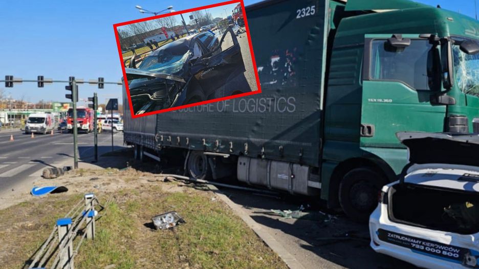 Ze wstępnych ustaleń wynika, że kierowca tira z naczepą zderzył się z samochodem osobowym (Uberem), po czym uderzył w sygnalizator świetlny na skrzyżowaniu i staranował kolejne samochody.