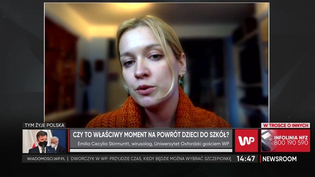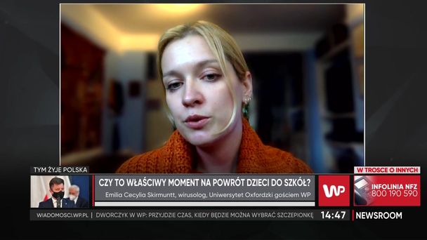 W weekend w Polsce zaszczepionych zostało tylko 4266 osób. Te niepokojące dane skomentował m.in. szef Kancelarii Premiera Michał Dworczyk, mówiąc, że liczba szczepień uzależniona jest od organizacji pracy szpitali węzłowych. O tym, jak przyspieszyć proces szczepień w Polsce rozmawialiśmy w programie Newsroom WP z Emilią Cecylią Skrimuntt, wirusolożką ewolucyjną z Uniwersytetu Oksfordzkiego. Jej zdaniem w usprawnieniu Narodowego Programu Szczepień pomogłoby stworzenie szczegółowej bazy danych o szczepionkach. W jej ocenie funkcjonowanie takiej bazy pomogłoby m.in. uniknąć utylizowania szczepionek. Skrimuntt stwierdziła również, że rząd nie powinien podejmować decyzji o powrocie dzieci do szkół od razu po feriach. Wirusolożka wyraziła opinię, że najpierw konieczne jest zaszczepienie możliwie największej grupy Polaków.