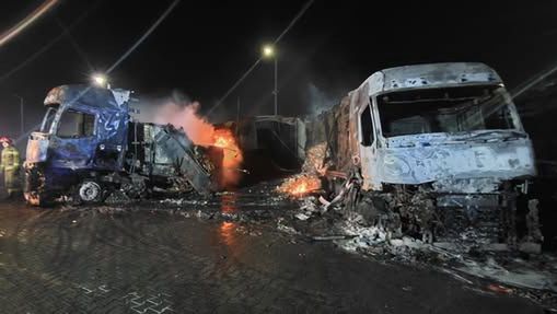- Sześć tirów spłonęło całkowicie, a inne pojazdy zostały uszkodzone.