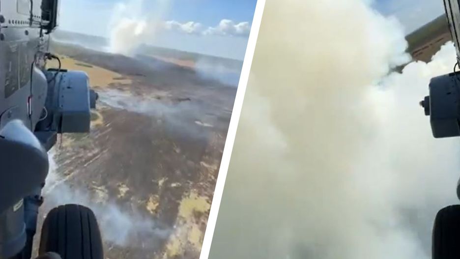 "Tak wyglądają zrzuty wody z pokładu policyjnego śmigłowca Black Hawk, którego załoga od wielu godzin prowadzi działania gaśnicze na terenie Biebrzańskiego Parku Narodowego" - podaje policja w mediach społecznościowych.