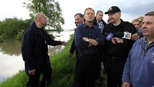 Kłoda k. Kozienic 20.05.2010. Premier Donald Tusk w obecności wojewody mazowieckiego Jacka Kozłowskiego (L) rozmawia z Zofią Konarską (P) sołtysem wsi Kłoda. Mieszkańcy Kłody aktywnie uczestniczą w obronie swojej wsi przed powodzią. Rozlana rzeka Radomka u ujścia do Wisły zagraża mieszkańcom wszystkich okolicznych miejscowości.