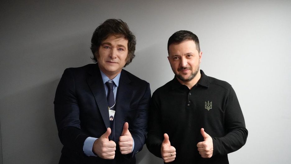 Na fotografii argentyński prezydent stoi w towarzystwie prezydenta Ukrainy. Obaj przywódcy pokazują pełen nadziei gest.