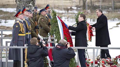 Prezydenci Polski i Rosji Bronisław Komorowski i Dmitrij Miedwiediew złożyli wieńce na lotnisku w Smoleńsku, przy brzozie, w której utkwił odłamek Tu-154M po katastrofie z 10 kwietnia 2010 roku.