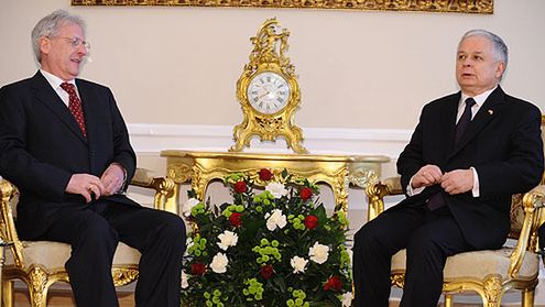 Warszawa, 23.03.2009. Prezydent Lech Kaczyński i prezydent Węgier Laszlo Solyoma rozmawiają podczas spotkania w Pałacu Prezydenckim.
