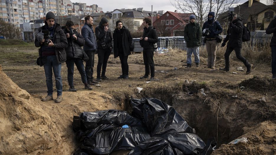 Na upublicznionych filmach widać olbrzymie zniszczenia i liczne ciała ofiar, leżące na ulicach bez broni i w cywilnych ubraniach. Ukraińskie ministerstwo obrony zamieściło na Twitterze film nagrany z samochodu jadącego przez podkijowską Buczę, z której siły ukraińskie wyparły żołnierzy rosyjskich. Na drodze i poboczu widać ciała w cywilnych ubraniach.