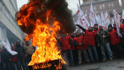 Demonstranci przynieśli ze sobą flagi i podpalili opony pod siedzibą firmy.