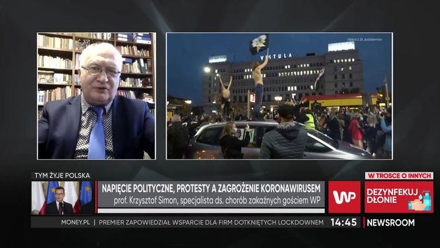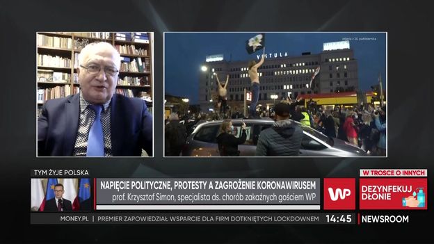 - Protesty dotyczą kolejnych "zaczepnych łajdactw intelektualnych", jak powiedział Donald Tusk. Po co nam w momencie epidemii, napiętej atmosfery kolejne zaognienia sprawy? - pyta w programie "Newsroom" prof. Krzysztof Simon. - Przecież co miesiąc jest jakaś afera. Tak się nie da funkcjonować. Wszystkie te spory trzeba wyrzucić i zajmować się tylko bytem państwa - podkreślił. Dodał, że nie można narzucać kobietom sposobu funkcjonowania. - To jest wielkie wyzwanie wychowywać te dzieci. Większość tych ciąż i tak szybko się kończy, albo dzieci rodzą się ciężko upośledzone - mówił. - Decyzję powinna podejmować kobieta, a nie pan Jędraszewski w Krakowie - podsumował. Stwierdził też, że demonstracje w maskach i w odległości na powietrzu to nie jest jakieś wielkie zagrożenie koronawirusem.