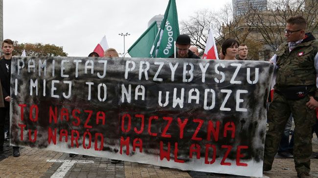 W Warszawie zebrali się też przeciwnicy przyjęcia do Polski uchodźców. Kilka tysięcy osób przeszło z pl. Defilad na pl. Zamkowy; na ich transparentach można było przeczytać m.in. "dzisiaj imigranci, jutro terroryści", a na bluzach "śmierć wrogom ojczyzny". Co pewien czas wybuchały petardy. Wśród skandowanych haseł pojawiały się np. "Polacy przeciw imigrantom" i inne hasła przeciw muzułmanom, a także krytykujące rząd. Według informacji policji marsz przebiegł dość spokojnie, nie odnotowano incydentów, nikt nie został ranny.