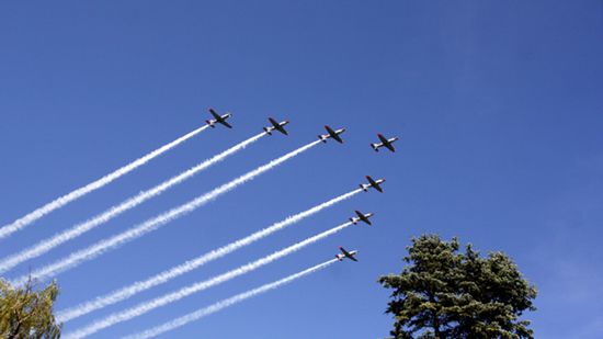 4 samoloty TS-11 Iskra w formacji "Flaga" przelatują nad warszawskim placem Trzech Krzyży.