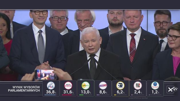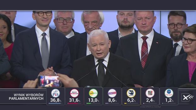 - To jest naprawdę wielki sukces naszej formacji i naszego projektu dla Polski. Oczywiście przed nami stoi jeszcze pytanie, czy ten sukces będzie można zmienić w kolejną kadencję naszej władzy. Tego jeszcze w tej chwili nie wiemy – powiedział prezes PiS Jarosław Kaczyński, komentując sondażowe wyniki wyborów. - Musimy mieć nadzieję, że niezależnie od tego, czy będziemy przy władzy czy będziemy w opozycji, to ten projekt będziemy na różne sposoby realizować – podkreślił prezes PiS. Jak wynika z pierwszych sondażowych wyników exit poll, wybory parlamentarne 2023 wygrywa Prawo i Sprawiedliwość, ale to opozycja będzie miała większość w parlamencie. Prawo i Sprawiedliwość zdobyło 36,8 proc. poparcia, Koalicja Obywatelska 31,60 proc., Trzecia Droga 13 proc., Lewica 8,60 proc., Konfederacja 6,20 proc., Bezpartyjni Samorządowcy 2,40 proc.