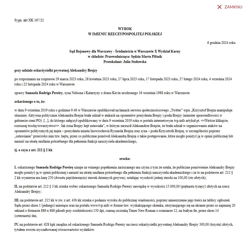 Sąd Rejonowy dla Warszawy - Śródmieścia uznał Samuela Rodrigo Pereirę za winnego pomówienia Aleksandry Brejzy. Sprawa dotyczyła wpisu na Twitterze z 2019 r., w którym Pereira zarzucił Brejzie udział w organizowaniu ataków na oponentów politycznych jej męża i syna. Sąd orzekł, że takie działanie mogło poniżyć Brejzę w opinii publicznej i zaszkodzić jej jako nauczycielowi akademickiemu.