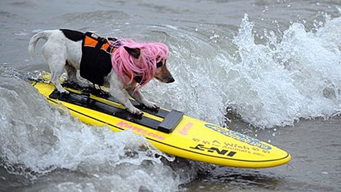 W Kalifornii po raz czwarty odbyły się zawody surfingowe dla psów. Obowiązywał hawajski strój (wzorzysta koszulka z krótkim rękawem) oraz ciemne okulary.