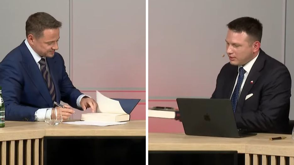 Rafał Trzaskowski na końcu rozmowy ze Sławomirem Mentzenem nie podpisał jego ośmiu postulatów tak, jak to zrobił wcześniej Karol Nawrocki. Prowadzący spotkanie zwrócił się jednak do lidera KO z prośbą o podpisanie jego książki "Rafał". - A może książkę chociaż mi pan podpisze? - zapytał. - Chociaż to uda się dzisiaj w Toruniu podpisać - dodał.