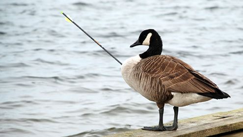 Gęś kanadyjska z tkwiącą w jej piersi strzałą sfotografowana na pomoście w miejscowości Kettlecreek w amerykańskim stanie New Jersey. Zaniepokojeni stanem zwierzęcia mieszkańcy powiadomili odpowiednie służby.