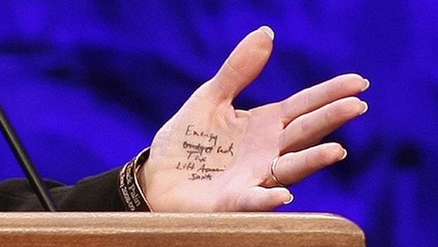 Była kandydatka Republikanów na wiceprezydenta USA Sarah Palin została uchwycona przez bezlitosne obiektywy ze ściągawką napisaną na ręce. Wystąpiła tak na zjeździe Tea Party (Partii Herbacianej, prawicowego ruchu protestu przeciw polityce prezydenta Baracka Obamy)