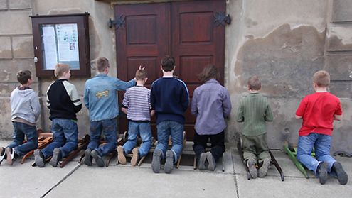 Tradycyjne wielkoczwartkowe bieganie z klekotami w Mnichowicach (woj. wielkopolskie)