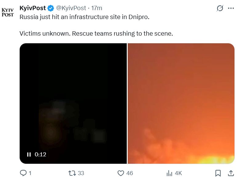Podaje, że Rosjanie ostrzelali również miasto Dniepr, niszcząc infrastrukturę.