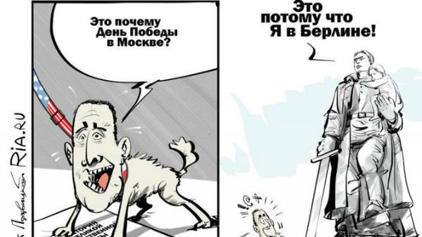 Ilustracja Ria Novosti przedstawia Schetynę, stojącego na książce "Historia Wielkiej Wojny Ojczyźnianej”. Do postaci psa domalowana jest chmurka ze słowami: "Dlaczego Dzień Zwycięstwa jest w Moskwie?".