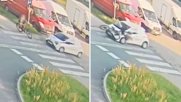 Dramatycznie wyglądające zdarzenie w Śremie. Kamera miejskiego monitoringu nagrała moment potrącenia młodego rowerzysty na przejściu dla pieszych. Materiał udostępniła policja ku przestrodze. Na nagraniu widać, jak grupa chłopców przejeżdża przez pasy, na których jest również miejsce dla rowerów. Gdy ostatni z nastolatków wjeżdża na drogę, zostaje potrącony przez białą toyotę. Uderzenie było na tyle silne, że chłopiec przeleciał przez kierownicę roweru, a następnie przez maskę auta i uderzył o asfalt. "Na szczęście chłopakowi nic się nie stało i policjanci drogówki zakończyli sprawę w postępowaniu mandatowym. Jednak uwagę funkcjonariuszy zwraca nie tylko zachowanie kierującej toyotą, ale też sytuacja, która miała miejsce tuż przed zderzeniem. Zachowanie małoletnich rowerzystów, którzy w ogóle nie uważają, ich brak rozwagi, brawura, jeżeli będą kontynuowane w ruchu drogowym, mogą doprowadzić do nieszczęścia" - apeluje policja. Poszkodowanym okazał się 13-letni chłopiec, który w momencie zdarzenia nie miał na głowie kasku. Policja przypomina, by mieć kask w czasie jazdy rowerem, ponieważ bez niego łatwiej o poważniejsze skutki.