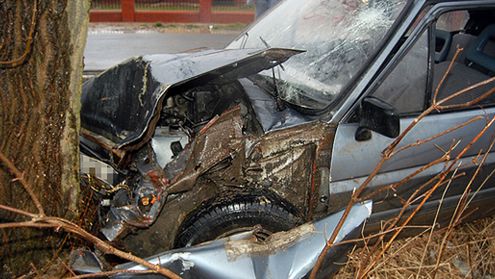 Ojciec zniszczył doszczętnie samochód dwa drzewa dalej od swojego domu. Miał ponad dwa promile alkoholu we krwi./ Źródło: Michał Dróbka/infobrzeg.pl