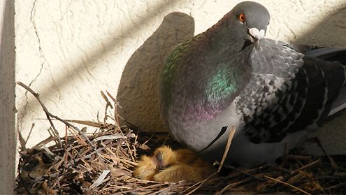 Na zdjęciu: gołąb w gnieździe z pisklakami, które właśnie się wykluły. Gniazdo znajduje się na balkonie Internautki Kasi w Toruniu. Małe gołąbki wykluły się 1 kwietnia, dokładnie wtedy, gdy opublikowaliśmy pierwszą fotografię z tego gniazda: Zaraz się wyklują!