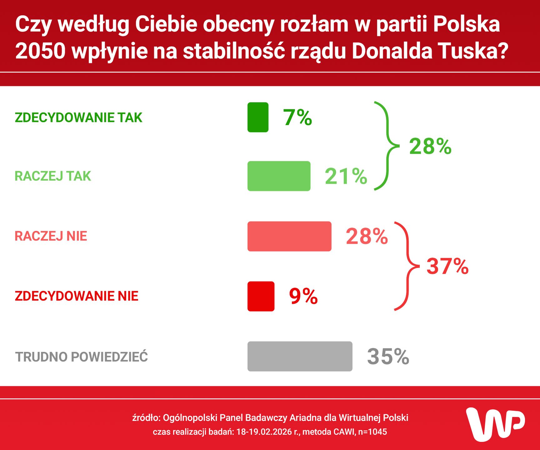 Wyniki badania przeprowadzonego dla Wirtualnej Polski na panelu Ariadna nie są jednoznaczne: 37 proc. badanych uważa, że podziały nie wpłyną na stabilność rządu (z czego 9 proc. twierdzi tak "zdecydowanie"). Przeciwnego zdania jest 28 proc. ankietowanych. Co istotne, aż 35 proc. Polaków nie potrafi jednoznacznie ocenić skutków tej sytuacji, co wskazuje na dużą niepewność ws. dynamiki wewnątrzkoalicyjnych sporów.
