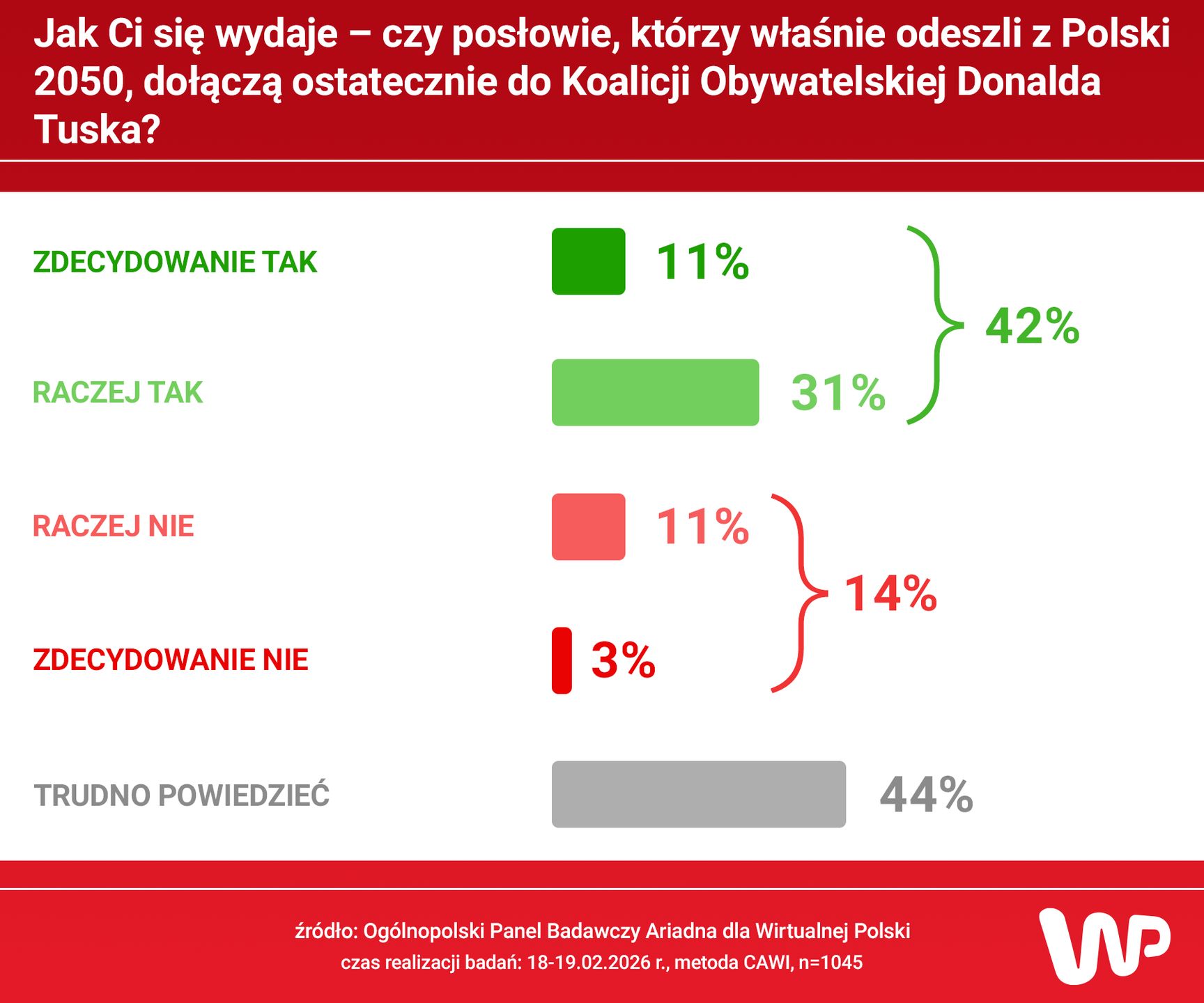W tym przypadku odnotowano najwyższy wskaźnik niezdecydowania: aż 44 proc. ankietowanych odpowiedziało "trudno powiedzieć". To sugeruje, że dalsza droga polityczna dezerterów z Polski 2050 pozostaje dla opinii publicznej zagadką.