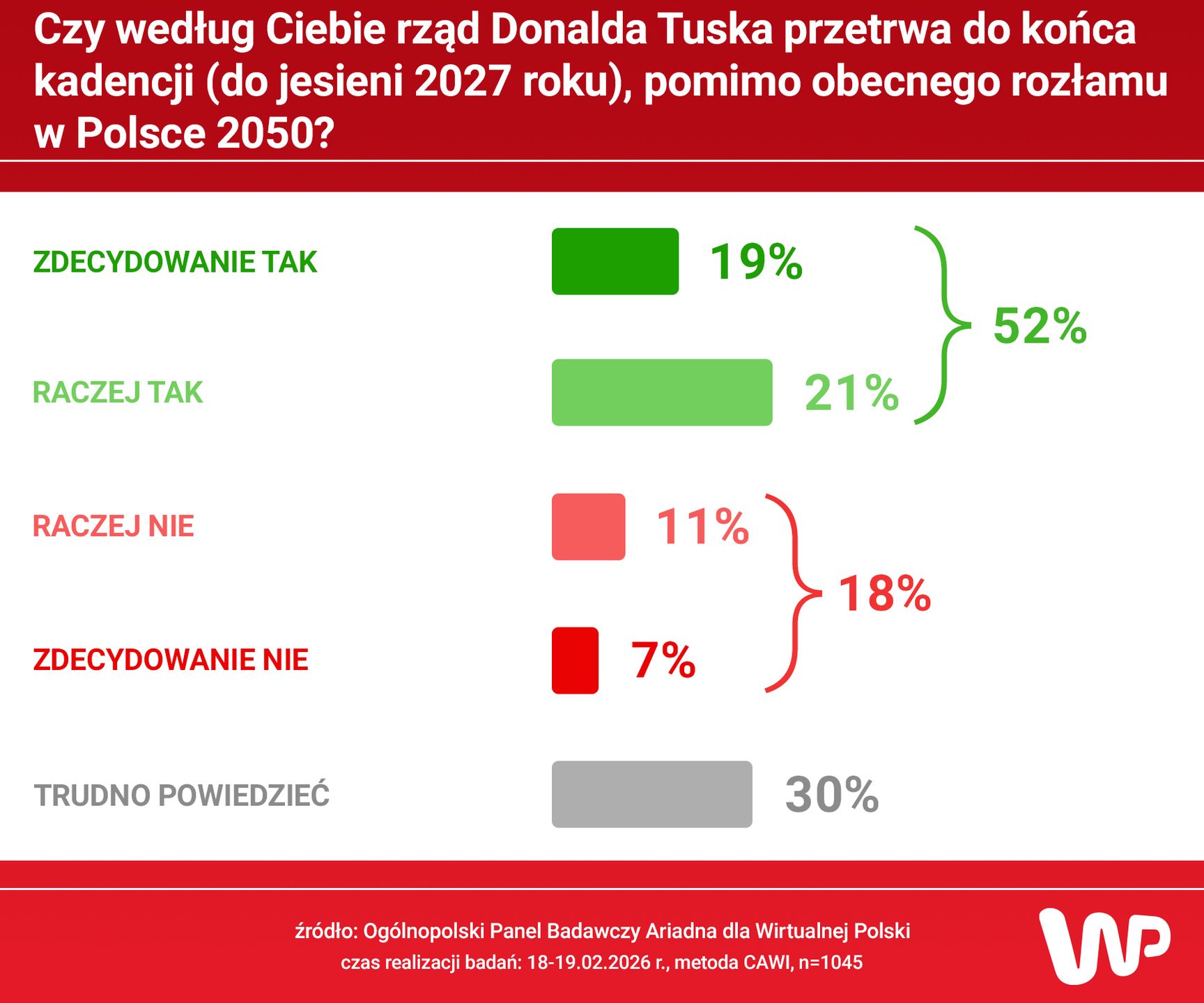 Mimo obaw o stabilność rządu Polacy w większości pozostają optymistami w kwestii trwałości gabinetu Donalda Tuska. Na pytanie, czy rząd przetrwa do jesieni 2027 roku mimo rozłamu w Polsce 2050, ponad połowa badanych (52 proc.) odpowiedziała twierdząco. W tej grupie 19 proc. jest o tym przekonanych "zdecydowanie", a 33 proc. "raczej".