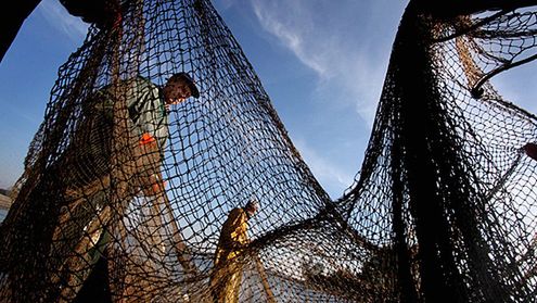 Po prawie całkowitym osuszeniu stawów pracownicy zaganiają ryby w jedno miejsce i je odławiają.