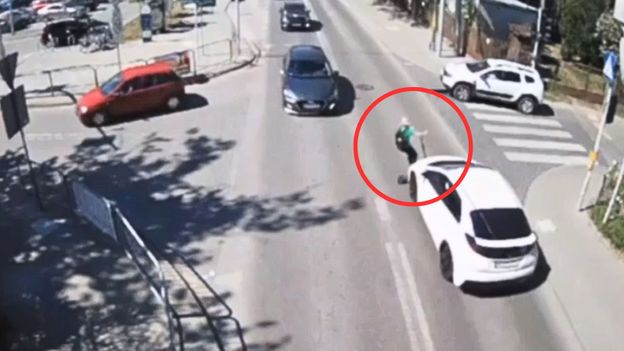 Dramatyczne nagranie z Piaseczna pod Warszawą. Kamera monitoringu zarejestrowała niebezpieczny moment na skrzyżowaniu na ul. Głównej. Chłopiec na hulajnodze w pewnym momencie próbował przejechać na drugą stronę, jednak na ulicy panował duży ruch, co zmusiło go do podjęcia ryzyka. 10-latek nagle wjechał wprost pod koła auta i został potrącony. Chłopiec był bez szans na reakcję. Jak informuje portal info112, 10-latek miał na głowie kask, a prędkość z jaką poruszał się pojazd nie była zbyt wielka, dlatego też skończyło się tylko na potłuczeniach. "O ogromnym szczęściu może mówić 10-latek, który jadąc hulajnogą elektryczną, zlekceważył czerwone światło na sygnalizatorze i wjechał wprost pod koła auta. Na całe szczęście skończyło się tylko potłuczeniami. Mogło jednak skończyć się tragedią. W trakcie rozmowy z policjantami, chłopiec stwierdził, że widział czerwone światło na sygnalizatorze dla jego kierunku jazdy, dlaczego więc pojawił się przed maską auta - wytłumaczyć już nie potrafił. Dodatkowo okazało się, że 10-latek nie posiada karty rowerowej, a więc dokumentu uprawniającego go do poruszania się po drodze na hulajnodze elektrycznej. Sprawa swój finał będzie miała w sądzie rodzinnym" - wyjaśniła sprawę policja.
