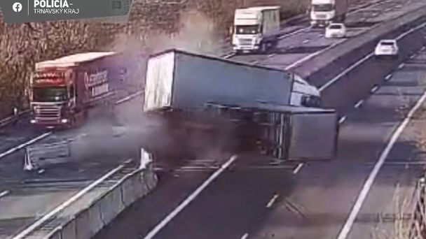 W środę rano na autostradzie D1 na Słowacji doszło do groźnego zdarzenia z udziałem ciężarówki – podał portal info112.pl. Moment wypadku zarejestrował monitoring. Wideo udostępniła słowacka policja. Do zdarzenia doszło około godziny 8 rano pomiędzy miejscowościami Trnawa a Hlohovec w kierunku Żyliny. Jak przekazała słowacka policja, 61-letni kierowca ciężarówki złapał gumę w swoim pojeździe, następnie stracił panowanie nad zestawem, wjechał na lewy pas, po czym uderzył w betonowe bariery i przewrócił się na bok. Na szczęście w groźnie wyglądającym wypadku, nikt nie został ranny. Policjanci nie wykryli alkoholu u kierowcy podczas badania oddechowego.