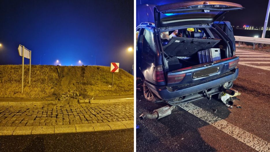 Auto przeleciało nad rondem. Kierowca pijany i z zakazem jazdy