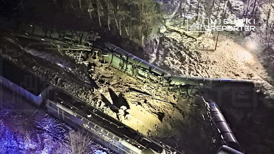 Są już pierwsze zdjęcia z miejsca zdarzenia. Widać na nich, jak wagony kolejowe leżą na boku w zaśnieżonym terenie. W tle pojazdy ratunkowe z włączonymi sygnałami świetlnymi.