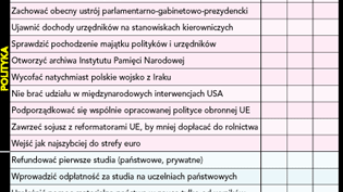 Tyle że nie wszystkim podoba się perspektywa przekopywania się przez partyjne dokumenty, statuty, projekty ustaw czy konstytucji lub uczestniczenia w spotkaniach wyborczych, by - jak się uda - zadać kilka pytań kandydatowi. Dlatego stworzyliśmy ściągę wyborczą, która przed niedzielnymi wyborami ma ułatwić to zadanie. Po konsultacji z czytelnikami ułożyliśmy listę pytań. Są to problemy interesujące zwykłego człowieka pogrupowane w trzy działy: polityka, społeczeństwo i gospodarka. Znane zarówno z głośnych debat polityków, jak i z szarej codzienności. Czy jesteś za karą śmierci? Czy należy otworzyć archiwa IPN? Podatki progresywne czy liniowy? A może wyprowadzić religię ze szkół i wstawić tam automaty z prezerwatywami? Czy znieść ograniczenia prędkości - z jednej strony tak denerwujące, z drugiej jednak gwarantujące większe bezpieczeństwo na naszych wspaniałych drogach? Lista obejmuje 42 zagadnienia.