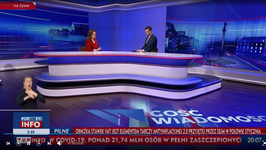 Gościem Danuty Hołeckiej w programie "Gość Wiadomości" był we wtorek minister sportu Kamil Bortniczuk. Rozmowa dotyczyła głównie wyjazdu polskich sportowców na zimowe igrzyska olimpijskie w Pekinie, ale także projektów na przyszłość, jakie planuje ministerstwo, chodzi m.in. o Społeczną Radę Sportu, która ma wystartować 16 lutego.