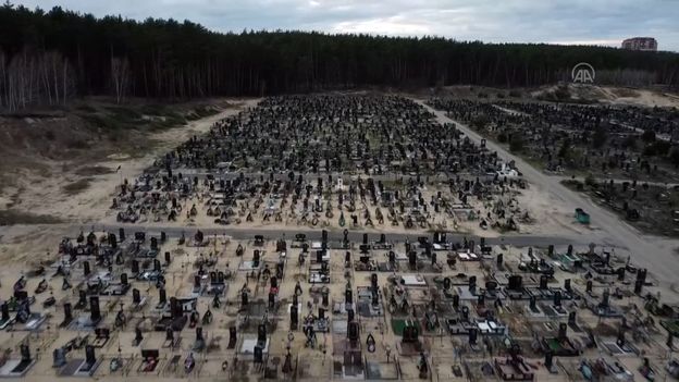 W miejscowości Irpień w obwodzie kijowskim pochowano już setki ofiar rosyjskiej inwazji na Ukrainę. Turecka agencja Anadolu, w poniedziałek 18 kwietnia, zarejestrowała dronem groby, w których spoczywają ciała cywilów. W ich pobliżu znajdują się zdjęcia ofiar zabitych przez wojsko rosyjskie. Dotychczas, od początku wojny w Ukrainie, ponad 900 cywilów zostało zabitych w Kijowie i jego okolicach. Angrej Nebitow, szef kijowskiej policji, powiedział podczas konferencji prasowej, że ponad 900 ciał znaleziono na obszarach, nad którymi ukraińskie siły odzyskały kontrolę. Największa liczba ofiar śmiertelnych została odnotowana w Buczy, gdzie znaleziono ponad 350 ciał. Według szacunków ONZ od rozpoczęcia wojny 24 lutego, w Ukrainie zginęło co najmniej 1982 cywilów, a 2651 zostało rannych, przy czym prawdziwa liczba jest znacznie wyższa. Jak poinformowała agencja ONZ ds. uchodźców, do innych krajów uciekło do tej pory prawie 4,8 mln Ukraińców, a ponad 7 mln osób zostało wewnętrznie przesiedlonych.