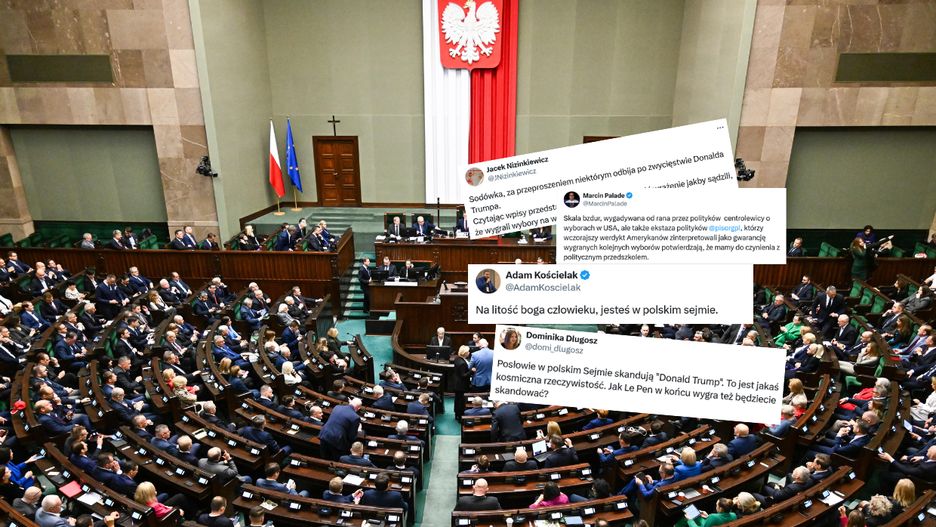 "Sodówka, za przeproszeniem, niektórym odbija po zwycięstwie Donalda Trumpa" czy "to jest jakaś kosmiczna rzeczywistość" - tak brzmią komentarze w sieci dot. zachowania posłów PiS i Konfederacji, którzy bardzo pozytywnie przyjęli wyniki wyborów w USA, m.in. skandując nazwisko Trumpa na początku środowego posiedzenia Sejmu.