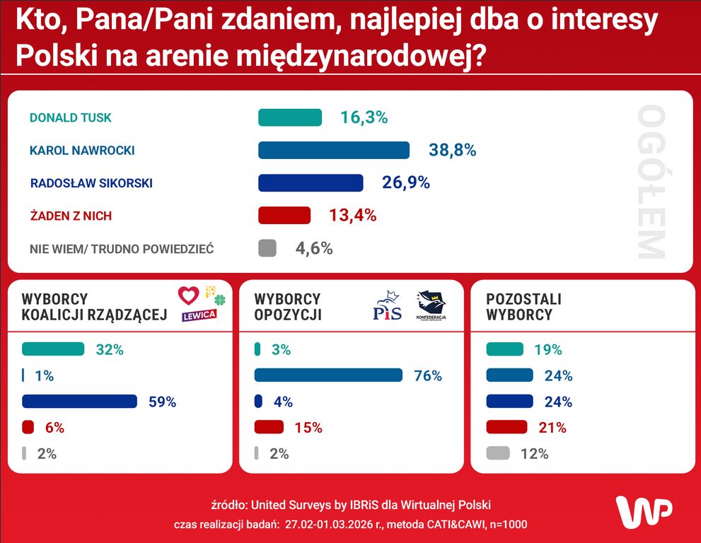 Badanie United Surveys by IBRiS dla Wirtualnej Polski zostało przeprowadzone w dniach 27.02-01.03.2026 r., metodą CATI & CAWI, na reprezentatywnej grupie 1000 dorosłych Polaków.