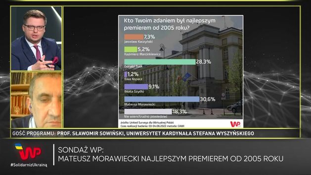 WP zapytała Polaków, kto był najlepszym premierem po 2005 roku. 30,6 proc. respondentów wskazało na Mateusza Morawieckiego. To daje mu przewagę 2,3 proc. nad drugim w zestawieniu Donaldem Tuskiem, który zdobył 28,3 proc. głosów. Wyniki sondażu skomentował gość WP prof. Sławomir Sowiński. - To wynika z tego, że PiS wyraźnie góruje nad PO w sondażach. To jest dosyć oczywiste. Wyniki badań dotyczące tego, kto był najlepszym premierem, zawsze pokazują kontekst bieżącej sytuacji - ocenił gość WP. - Myślę, że gdyby przeprowadzić dłuższe, głębsze, poważniejsze badania, gdyby pozwolić wyborcom sięgnąć do ich pamięci politycznej, to być może przypomnieliby sobie innych premierów z lat 90, których dobrze wspominają. Ja np. znam takie badania, w których coraz lepiej wspomina się choćby Jerzego Buzka czy Tadeusza Mazowieckiego. Ale obecnie rzeczywiście jest tak, że ta nasza bezpośrednia pamięć polityczna jest w jakimś sensie przesłonięta tym, co się dzieje tu i teraz - mówił prof. Sowiński. Jak ocenił ekspert, "ważny jest zespół". - Nikt nie jest sam w stanie wygrać wyborów. Ani Donald Tusk nie jest sam w stanie Platformy przeprowadzić ponad te 30 punktów procentowych w sondażach i potem poprowadzić jej do zwycięstwa. Potrzebuje po prostu zespołu. I też Prawo i Sprawiedliwość, jeśli chce myśleć o trzeciej kadencji, potrzebuje odmłodzonego zespołu, kilkudziesięciu naprawdę sprawnych polityków, którzy trafią do wyborców, będą wyborców słuchali, będą mówili ich językiem, dadzą im poczucie bezpieczeństwa i stabilności. Na końcu liczy się gra zespołowa i ważny jest trener (…) - podkreślił ekspert.