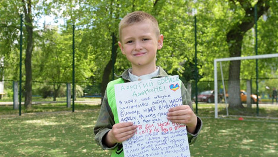 "Chcę grać w piłkę nożną w moim rodzinnym mieście Mariupol" - napisał 6-latek i zaznaczył, że jego pragnieniem jest to, aby żadne dziecko nie doświadczyło wojny w swoim życiu.