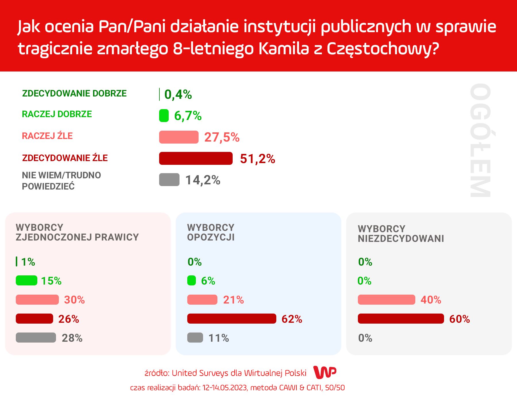 78,7 proc. badanych krytycznie ocenia działania instytucji ws. zmarłego chłopca. 27,5 proc. Polaków ocenia te działania "raczej źle". Aż 51,2 proc. rodaków uważa, że "zdecydowanie źle". 14,2 proc. respondentów nie ma zdania w tym temacie - wynika z sondażu dla WP.