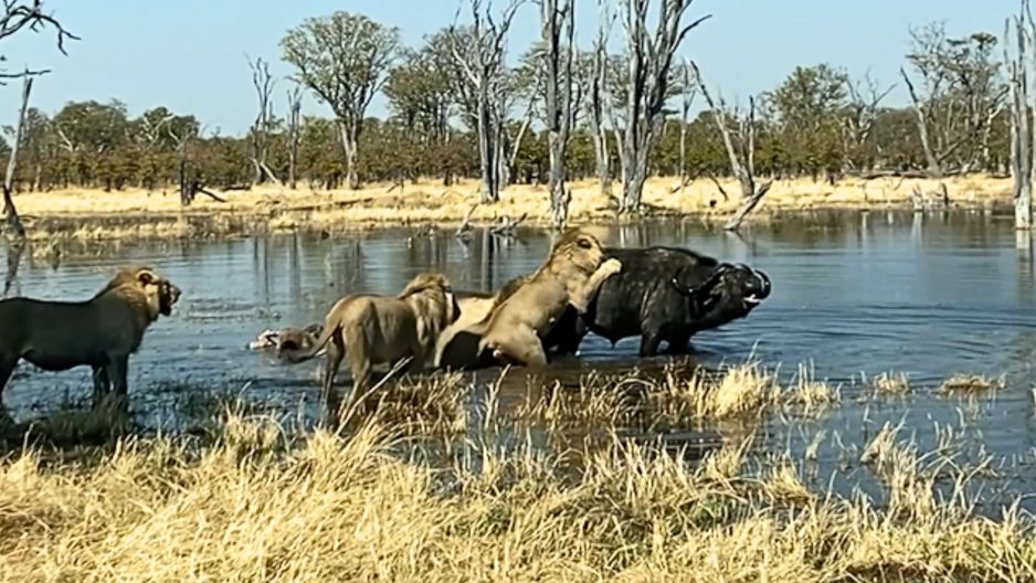 Niezwykłe nagranie z wycieczki safari. Nieustraszony bawół przetrwał prawie godzinny atak sześciu lwów. Ofiara drapieżników wykazała się sprytem. Na udostępnionym nagraniu przez agencje Reutera widać, jak lwy wskakują na grzbiet swoje ofiary, podczas gdy bawół bohatersko wciąga je do wody. Pomimo poradzenia sobie w ten sposób z większością lwów, jeden wytrwały drapieżnik nie chciał odpuścić swojej ofierze. Co ciekawe, bawół działał według planu i najpierw przeszedł na środek zbiornika wodnego, a następnie mocno uderzył lwa masywnymi rogami, płosząc drapieżnika. Ranne zwierzę ostatecznie uciekło w bezpieczne miejsce. Stado lwów poniosło porażkę. Wszystko działo się na oczach turystów w trakcie wycieczki safari w Rezerwacie Moremi Game w Botswanie.