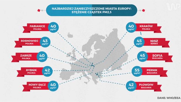 Zanieczyszczenie powietrza przyczynia się do przedwczesnej śmierci 45 tys. Polaków rocznie. Według Międzynarodowej Organizacji Zdrowia, najbardziej szkodliwym z zanieczyszczeń są cząsteczki PM2,5. W 30 polskich miastach dopuszczalne średnie stężenie tych cząstek w powietrzu jest przekroczone.