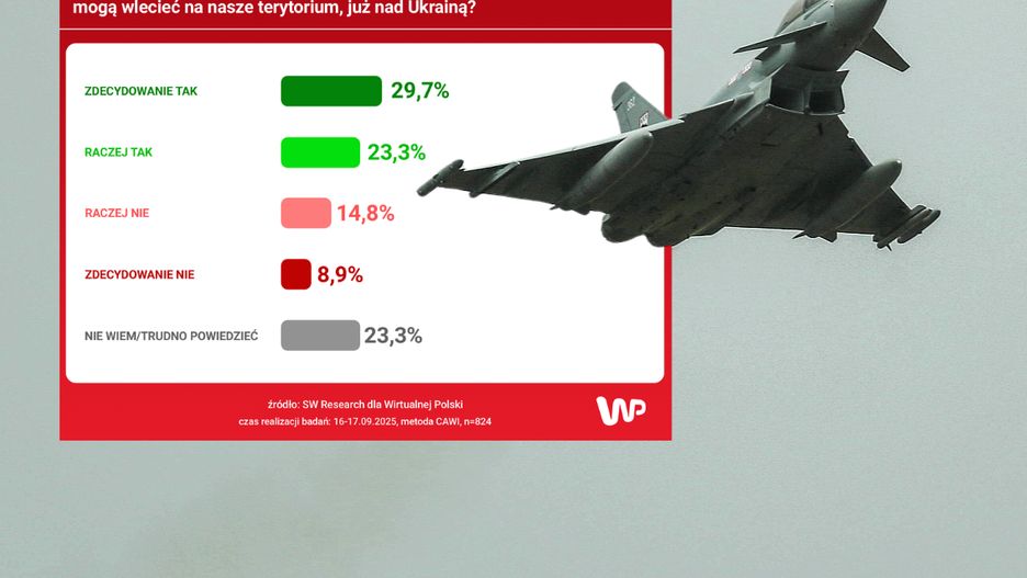 Według sondażu przeprowadzonego przez SW Research dla WP, 53 proc. badanych uważa, że Polska powinna strącać rosyjskie drony i rakiety, które mogą wlecieć na nasze terytorium, już nad Ukrainą. Zdecydowanych w tej kwestii jest 29,7 proc. ankietowanych.
